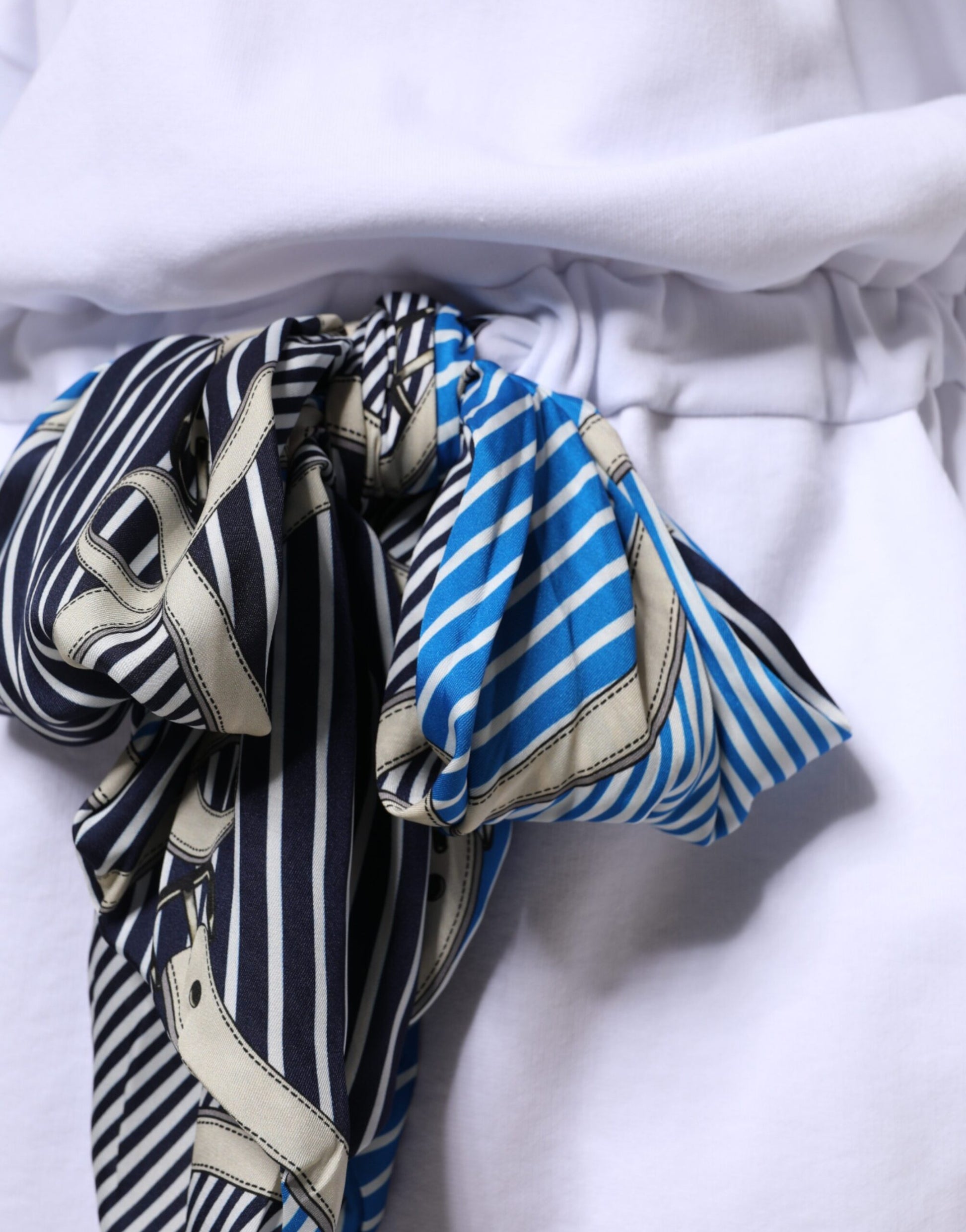 White Cotton Belted Long Sleeves Crew Neck Mini Dress